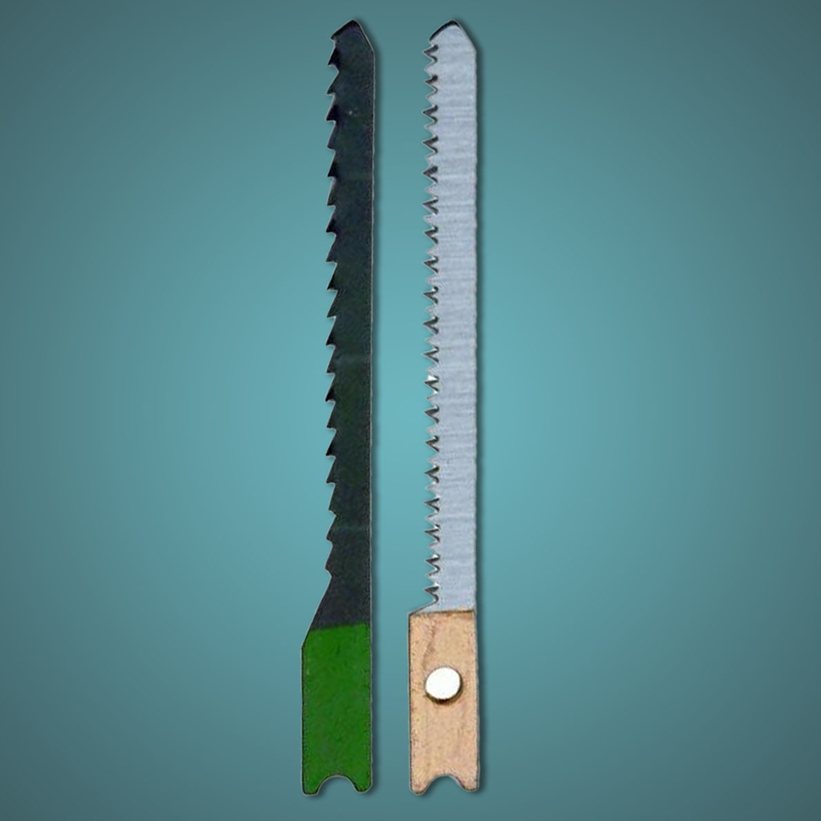 Each package contains 2 blades: one blade (gold) for material up to 1/8" thick, and one blade (green) for thicker materials. Designed to cut acrylic, polycarbonate, and styrene so smoothly that edges can be polished. Blades are 3.75" long.